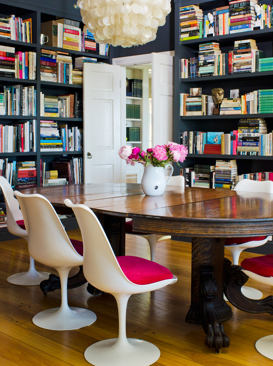 Minnie Mortimer’s bookshelves have been numero uno in my inspiration file ever since I first laid eyes on them. They just kill me. It is my single biggest interior design goal to one day have a home library very similar to this. Whenever I buy another new book that I do NOT need because I already have roughly a million waiting to be read, I think in the back of my mind of these bookshelves, and of how someday I MUST have them, and when that day comes how I better be prepared with books to fill them! And then I am justified in spending more money and accruing more books. Because one day I will have wall to wall, floor to ceiling bookshelves, crammed with books.